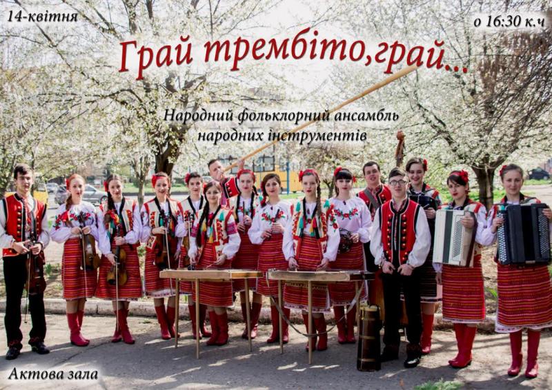 14 квітня, о 16.30 в актовій залі Ужгородського коледжу культури і мистецтв відбудеться концерт народного фольклорного ансамблю народних інструментів. Керівник ансамблю Валентина Вігула.