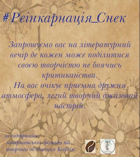 30 січня у музеї-кав’ярні «під Замком» за ініціативи творчого об’єднання «Кофеїн» та за підтримки ГО «Закарпатська громада» відбувся творчий вечір «#Реінкарнація_СНЕК».