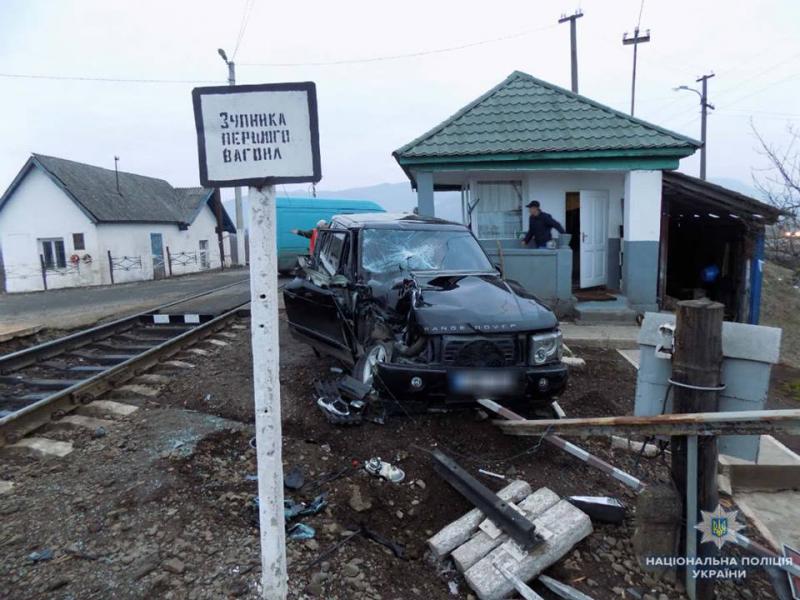 «Land Rover» зачепив потяг на залізничному переїзді і авто відкинуло, водій отримав травму плеча. Його доставлено до лікарні у Виноградові. Життю чоловіка нічого не загрожує.