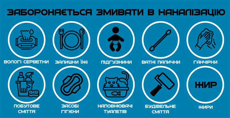Наголошуємо: унітаз і раковина – не сміттєвий контейнер! Неправильна експлуатація каналізації призводить до засмічення трубопроводів, руйнування решіток, засмічення насосних агрегатів, що призводить до аварійних зупинок каналізаційних насосних станцій та виливання стічних вод на вулиці, в підвали та житлові приміщення.