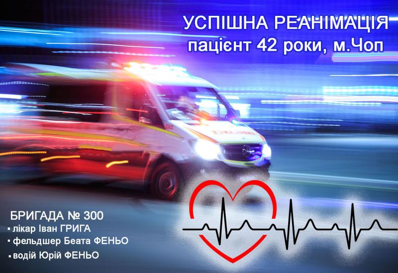 Бригада № 300 (лікар Іван ГРИГА, фельдшер Беата ФЕНЬО, водій Юрій ФЕНЬО) за кілька хвилин були біля пацієнта. У 42-річного чоловіка виявилися порушення серцевого ритму, він знепритомнів, ????дихання та ????серце зупинилися… Медики негайно розпочали реанімаційні заходи... І вже за 8 хвилин серцевий ритм та дихання відновлено, пацієнт приходить до свідомості. Стабілізувавши пацієнта, бригада «екстренки» транспортувала його до Ужгородської міської багатопрофільної клінічної лікарні.
