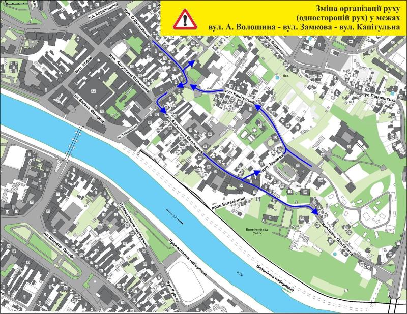 Із 27 грудня запрацював односторонній рух на вулицях Капітульній та Замковій. Відтепер ними можна їздити тільки в напрямку спуску від замку до міста, зворотній рух облаштували по вулиці Волошина.