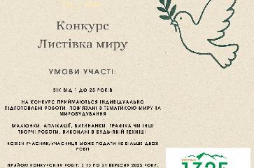 Коаліція 1325-Закарпаття з нагоди Міжнародного дня миру та Дня миру в Україні оголошує конкурс творчих робіт «Листівка миру». До участі запрошуються діти та молодь віком до 25 років.