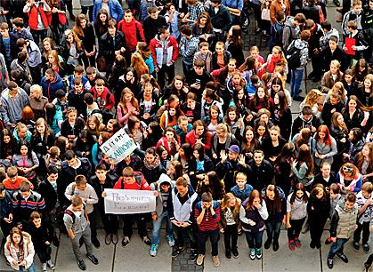 А вже в понеділок «шкільне» питання переросло в політичний фарс (див. стор. 1) із киданням яєць, маршами до Закарпатської ОДА, чим було повністю паралізовано рух на вул. Довженка, й перекриттям руху на вул. Ракоці. Частина батьків зійшлися на тому, що просто не пускатимуть дітей до школи, а школярі вирушили на транспортний міст, аби своєю присутністю заблокувати на ньому рух.