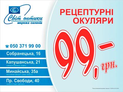Як і торік, закарпатська мережа оптичних салонів «Світ оптики» продовжує соціальну акцію на рецептурні окуляри за ціною 99 грн.*! У вартість входить як виготовлення окулярів, так й індивідуальний підбір рецептурних лінз та оправи. Акція діє тільки до 31 грудня 2013 р. на визначений асортимент оправ та окулярних лінз, тому поспішайте — вибір таких окулярів буде зменшуватися.