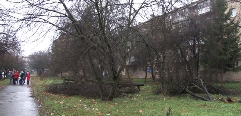 Це відбувається на зеленій зоні на вулиці Заньковецької, 4. Мешканці будинку обурені: 10 грудня невідомі особи почали вирізати здорові фруктові дерева перед багатоповерхівкою, а аварійні — залишили.