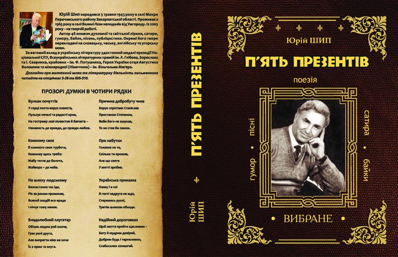 Саме так можна б назвати 48 книг письменника Юрія Шипа на форзацних світлинах вибраних творів у ювілейному виданні «П’ять презентів» (лірики, пісень, гумору, сатири і байок) з нагоди його вісімдесятиліття.