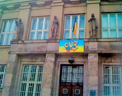 Кілька тижнів тому «прикраса» з’явилася над центральним входом до будівлі Закарпатського обласного відділення Нацбанку. І тепер активісти, небайдужі до архітектурного обличчя рідного міста, гадають, чи довго вона ще там висітиме, адже зображення аж ніяк не вписується в загальний ансамбль будівлі?