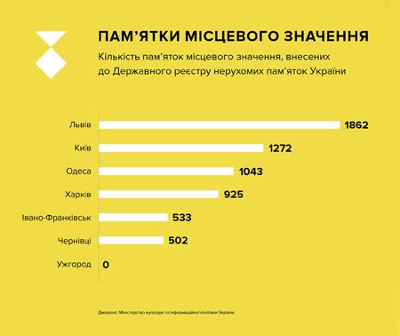 Для порівняння наведено кількість пам’яток місцевого значення, внесених до Державного реєстру нерухомих пам’яток України, у великих містах України та кількох найближчих обласних центрів — сусідів Ужгорода — у Львові, Івано-Франківську та Чернівцях.