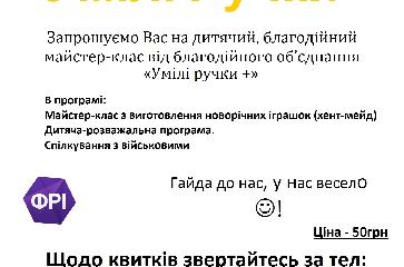 Молодіжна організація ФРІ разом з благодійним об'єднанням мам "Умілі ручки+" проведе дитячий благодійний майстер-клас з виготовлення новорічних іграшок.