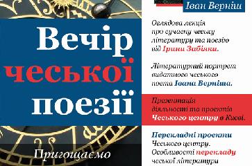 Літературний портал «LITFEST» та «Чеський центр» радо запрошують всіх охочіх 22 лютого в Чеський центр у Києві (вул. І. Франка, 24а, ст.м. «Золоті ворота») відвідати «Вечір чеської поезії».