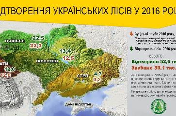 Протягом 2016 року у лісогосподарських підприємствах, які належать до сфери управління Державного агентства лісових ресурсів України, були відтворені ліси на площі 52,6 тис. га, що перевищує площу суцільних зрубів* (50,1 тис. га) майже на 5%.