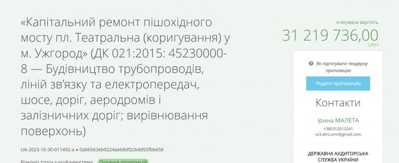 Замовником робіт є Департамент міської інфраструктури Ужгородської міської ради. Очікувана вартість проведених робіт сягне 31 млн 219 тис. 736 грн.